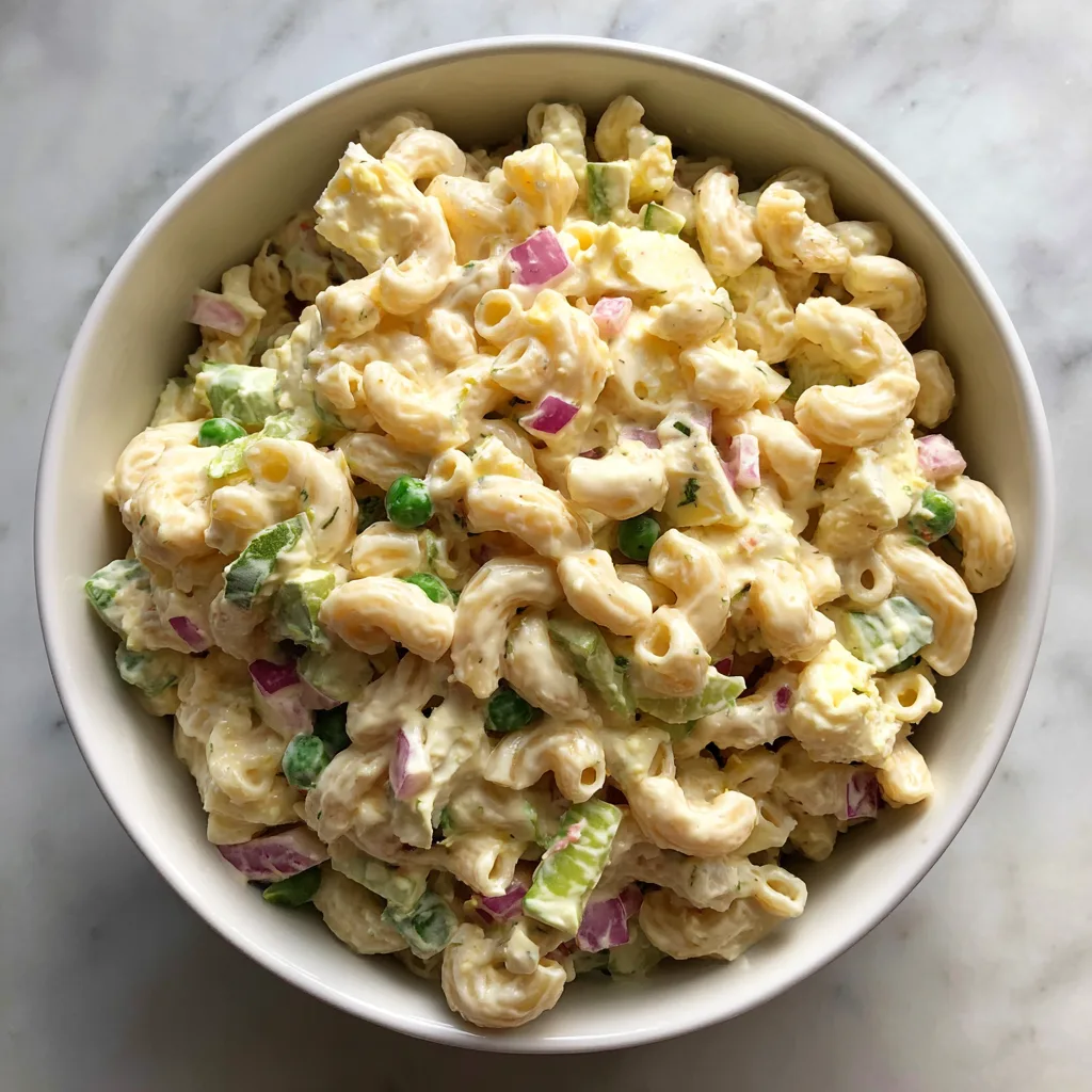Creamy Amish-style macaroni salad with sweet-tangy dressing, crunchy celery, and eggs, chilled for peak picnic flavor.