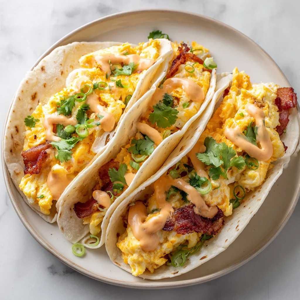Crispy bacon, fluffy cheddar eggs, and a fast chipotle-lime sauce tucked into warm tortillas for an easy, craveable breakfast taco situation.