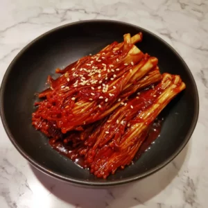 Tender enoki mushrooms braised in a Korean-inspired soy-gochujang sauce until glossy and deeply savory.