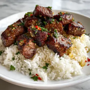 Return the steak bites to the pan and toss in the garlic butter sauce to coat. Let them soak up all that buttery goodness for about a minute on low heat. Spoon the steak bites over a bed of warm rice, making sure to drizzle any remaining garlic butter sauce from the pan over everything.