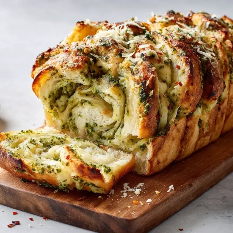If you’ve ever wanted to turn pesto into a full-on experience instead of just a sandwich spread, this cheesy pesto pull-apart bread loaf is your dream come true. Soft, buttery layers of homemade bread are stacked high with basil pesto, gooey mozzarella, and parmesan, then baked until golden and irresistible. It’s everything you love about pull apart bread, but with a visually stunning loaf shape that slices apart in beautifully stacked sheets.