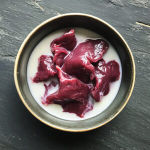 Place the liver in a bowl and cover it with milk or buttermilk. Soak for at least 30 minutes to reduce its strong flavor.