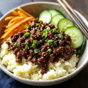Divide cauliflower rice between two bowls. Top with the beef mixture, shredded carrots, cucumber, sesame seeds, and sliced avocado, if using.