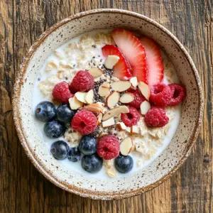 In the morning, give the Bircher muesli a good stir. Add extra berries, a drizzle of honey, and a sprinkle of toasted almonds for added texture and flavor.
