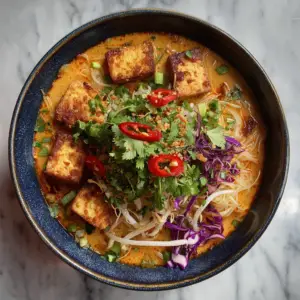 Divide the noodles among four large bowls. Ladle the hot laksa broth generously over the noodles. Top each bowl with tofu, bean sprouts, cabbage, cucumber, scallions, cilantro, and optional red chili slices.