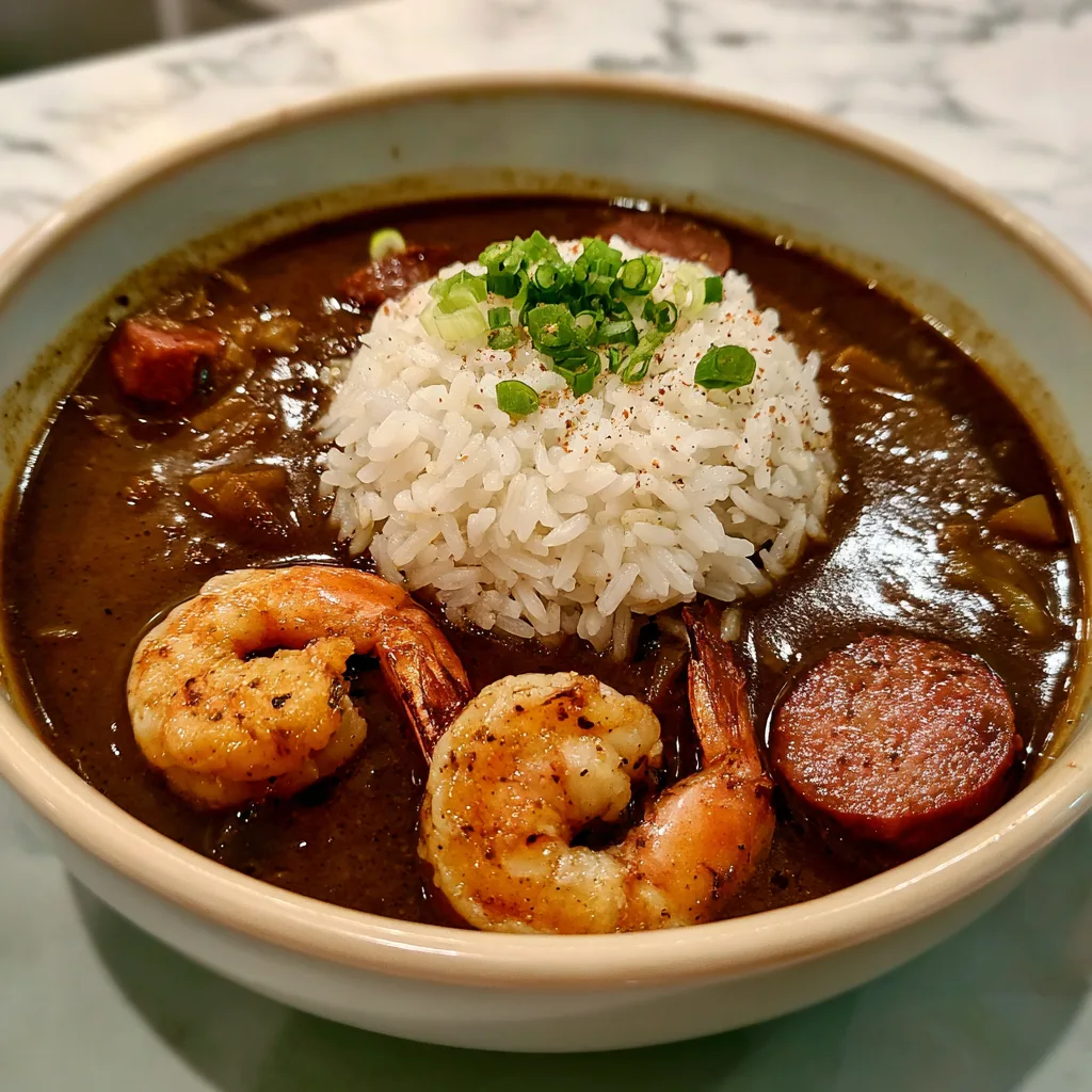 A bold, roux-thickened Cajun-style swamp soup with smoked sausage, shrimp, okra, and a bayou-bright finish of lemon and herbs.