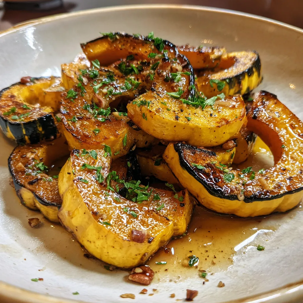 Caramelized delicata squash half-moons finished in a quick maple-butter glaze and topped with toasted pecans.
