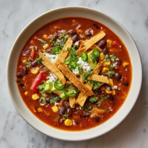 Ladle into bowls and top with tortilla strips, avocado, cotija, sour cream, cilantro, and jalapeรฑo. For the best texture, add crunchy toppings right before eating so they stay crisp.