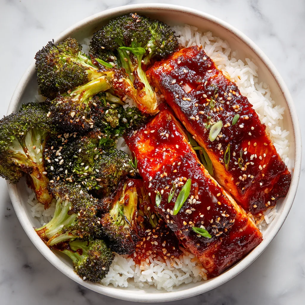 Roasted salmon with a glossy gochujang-honey-soy glaze, served with crisp-edged sesame broccoli and a bright squeeze of lemon.