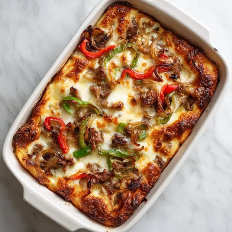 For a more hands-off method, you can adapt this into a philly cheesesteak crockpot style bake. Cook the steak, peppers, and onions as directed, then layer everything (except the egg and bread mixture) in a slow cooker on low for 3–4 hours. Serve over toasted bread or rice instead of baking it casserole-style.