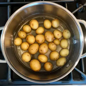 Place the baby potatoes in a large pot, cover with water, and add a generous pinch of salt. Bring to a boil and cook until the potatoes are fork-tender, about 15 minutes. Drain and let them cool slightly.