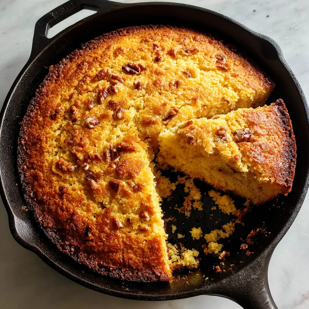 Tender, lightly sweet cornbread baked in a hot cast iron skillet with maple syrup, corn, and toasted pecans for crisp edges and a buttery crumb.