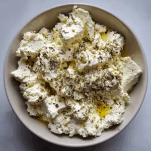 For marinated feta: Form small cubes or chunks with a spoon, and submerge them in a jar with olive oil, oregano, garlic, and chili flakes for a homemade marinated feta vibe.