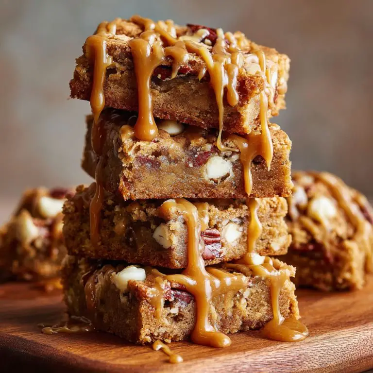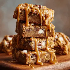 Allow the blondies to cool in the pan for at least 15 minutes before lifting them out and slicing. Once cooled, drizzle generously with the salted caramel sauce.