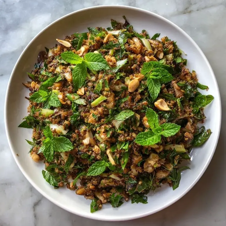 This vegan Thai larb with mushrooms and herbs is one of those dishes that feels light and vibrant yet deeply satisfying. Traditionally, larb is a minced meat salad bursting with lime, herbs, and toasted rice powder, but this plant-based version swaps meat for finely chopped mushrooms that soak up all those bold Thai flavors beautifully. It’s tangy, savory, slightly spicy, and packed with fresh herbs like mint and cilantro that make every bite feel alive. Whether you’re focused on clean eating, exploring vegan asian food, or just craving something refreshing and bold, this mushroom larb hits the sweet spot between comfort and brightness. It’s the kind of dish that works equally well as a quick weeknight dinner, a shared platter for friends, or a standout addition to a spread of vegetarian asian recipes.