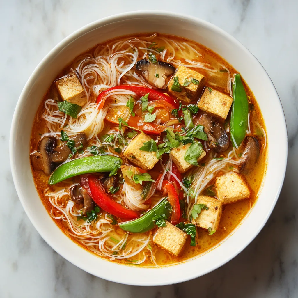A bright, spicy vegan tom yum soup with rice noodles, mushrooms, and crisp vegetables in a fragrant lemongrass-lime broth.