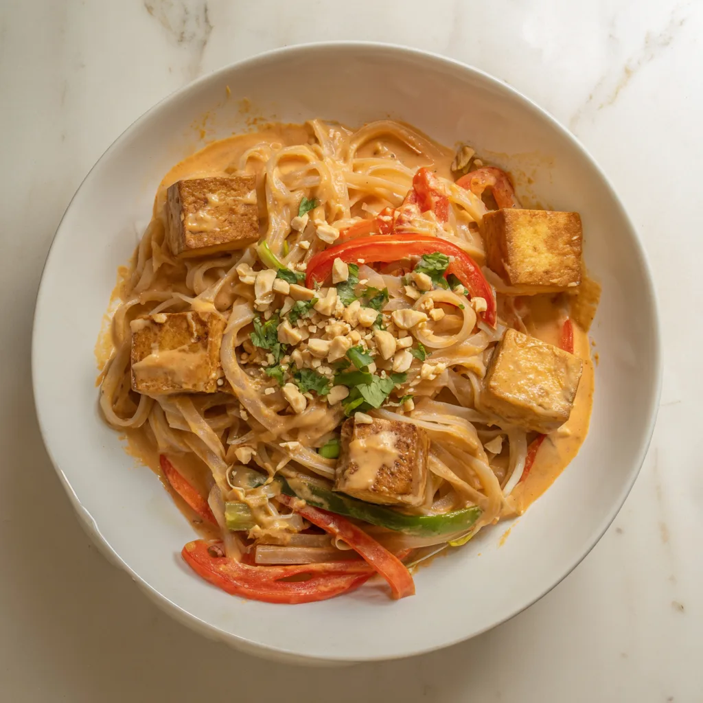 This vegetarian pad thai curry with tofu and bell peppers is what happens when pad thai gets a little cozy with a Thai curry night. You still get the chewy rice noodles, tangy-sweet-salty vibe, and big crunchy toppings, but there's also a silky coconut-curry sauce that clings to every strand. It's weeknight-friendly, pantry-flexible, and genuinely satisfying without needing meat. The tofu soaks up the sauce like a champ, the peppers stay sweet and crisp-tender, and the whole thing finishes with a bright hit of lime and roasted peanuts that makes you want to eat it straight out of the wok.